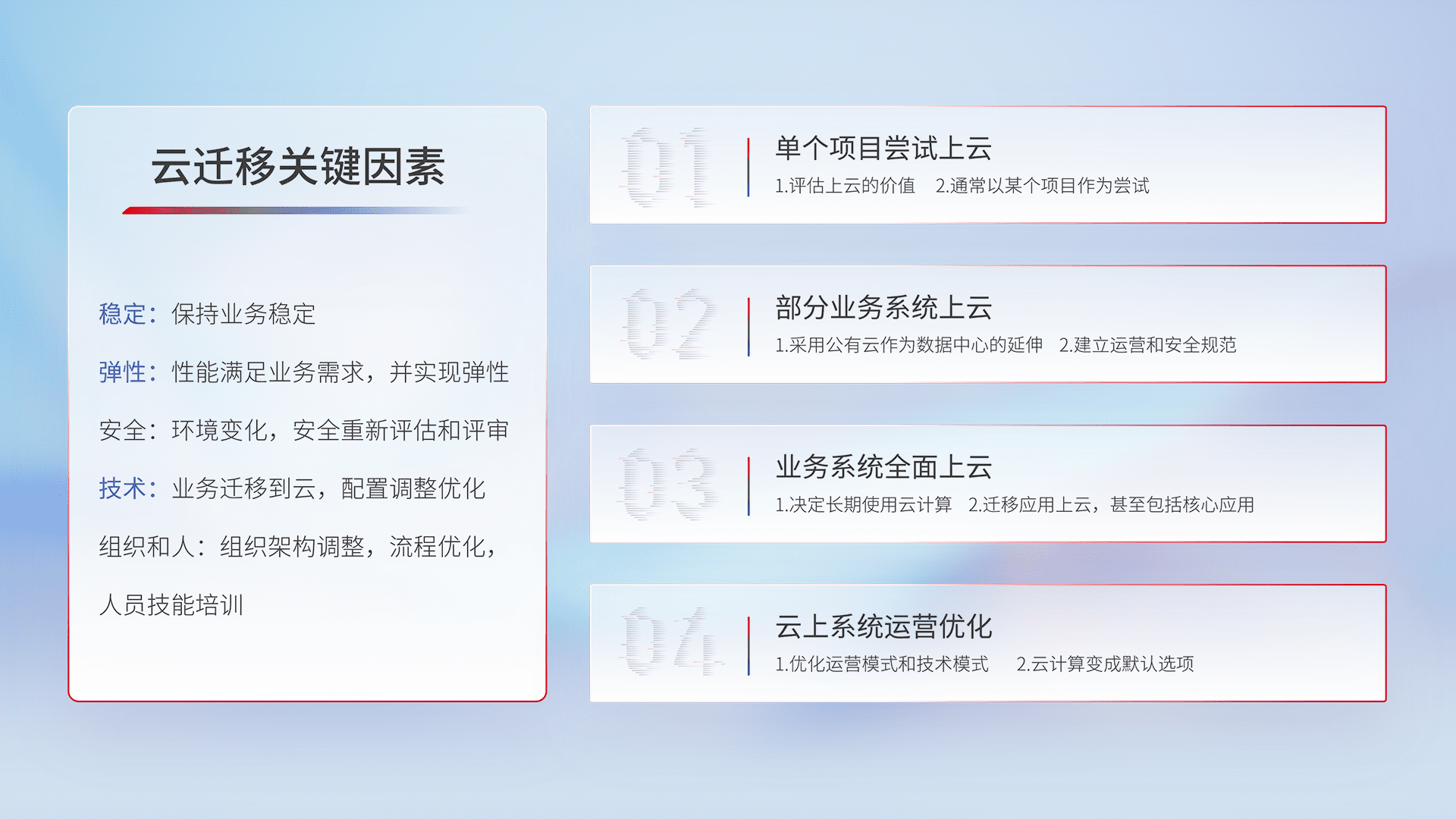 结合实际业务,,从规划设计、、云平台选型、、、云原生改造、、、、数据迁移、、集成交付,,,,迁移全过程为客户识别最佳上云路径,,做好风险识别管理,,,,设计网络架构、、、、身份权限、、安全审计合规、、操作审计、、、、日志审计、、监控告警策略、、、、多站点容灾设计等,,,对云上基础设施进行整体规划,,,,提升IT治理水平,,以满足弹性、、、高可用、、高性能的需求。。。